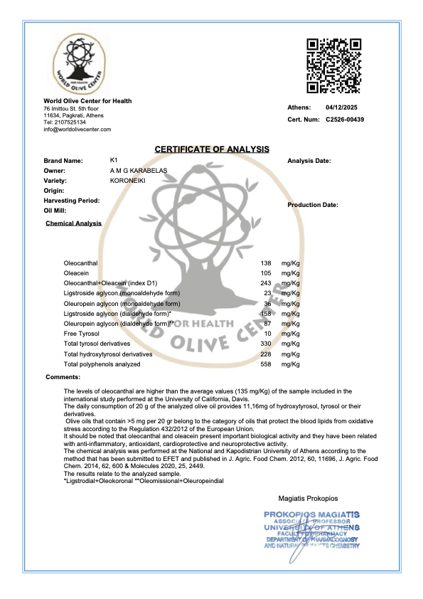 Gentle, rounded, and easy to enjoy, this oil offers a softer expression of Greek olive oil while still delivering a naturally high level of polyphenols — a rare balance of mild taste and measurable quality.